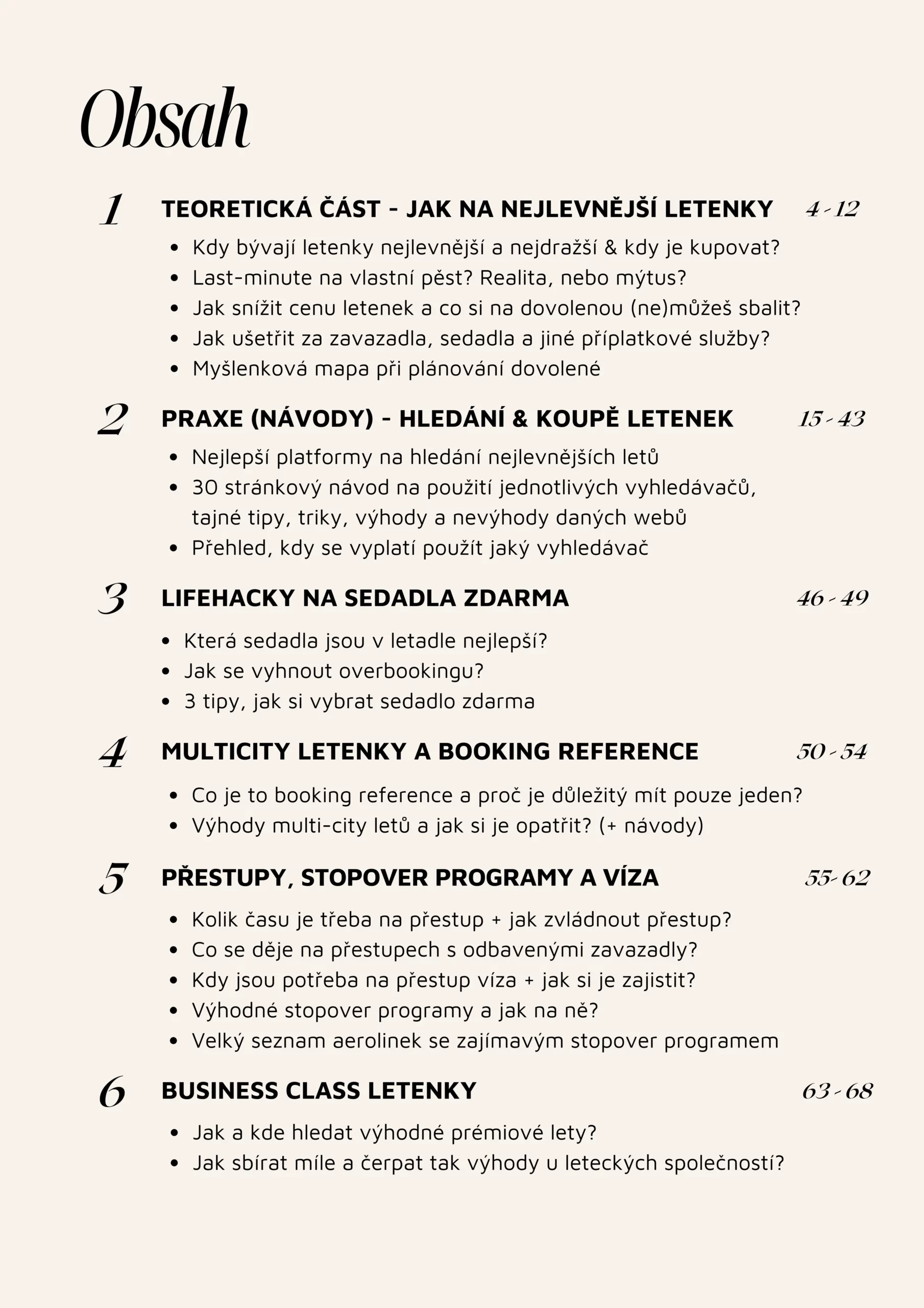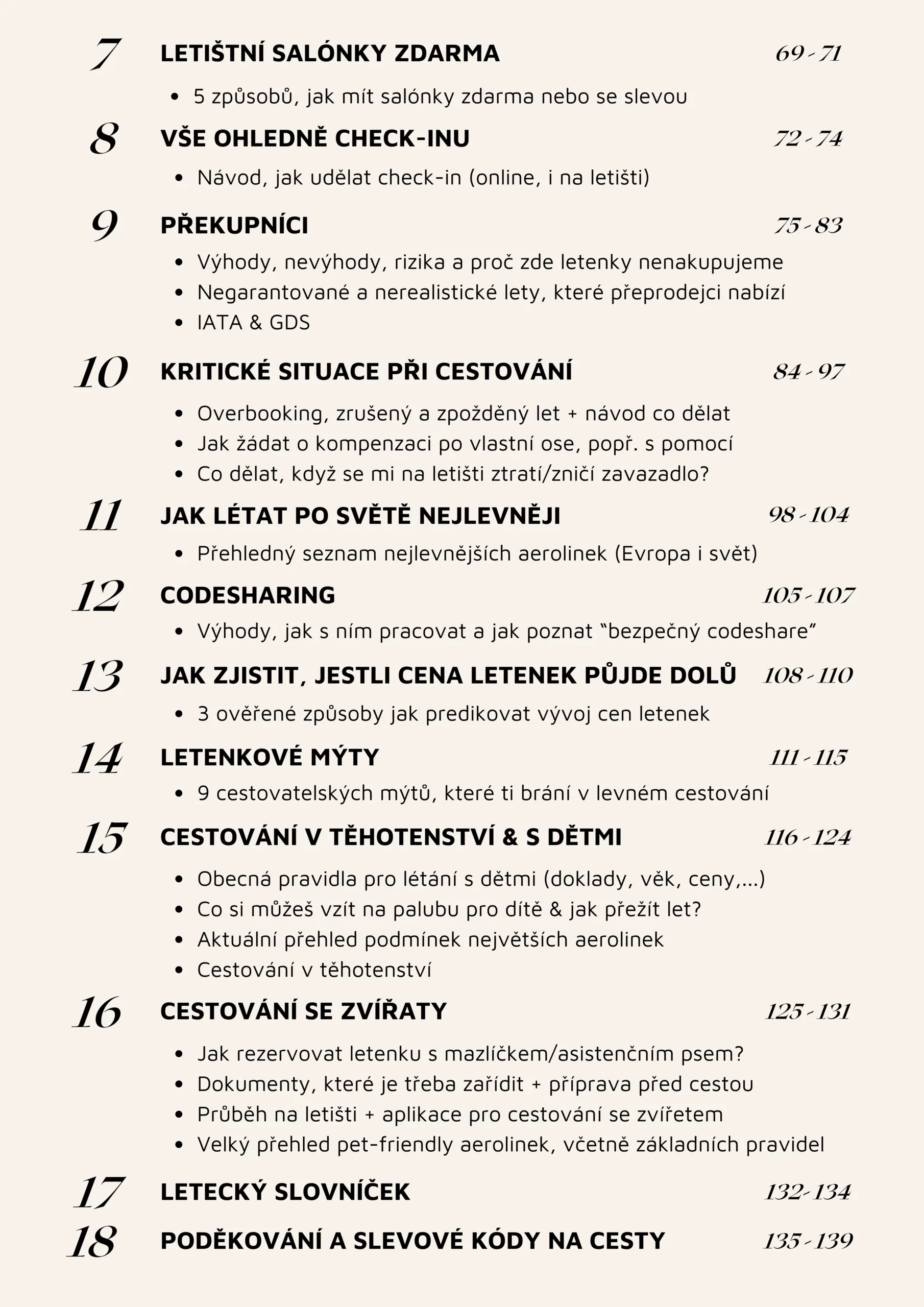 V knize pokrýváme veškeré odvětví létání a to včetně levných business class letenek nebo cestování s dětmi. Zároveň tě naučíme jak poznat rizikovou letenku, kdy (ne)koupit letenku u překupníka a spoustu dalšího!